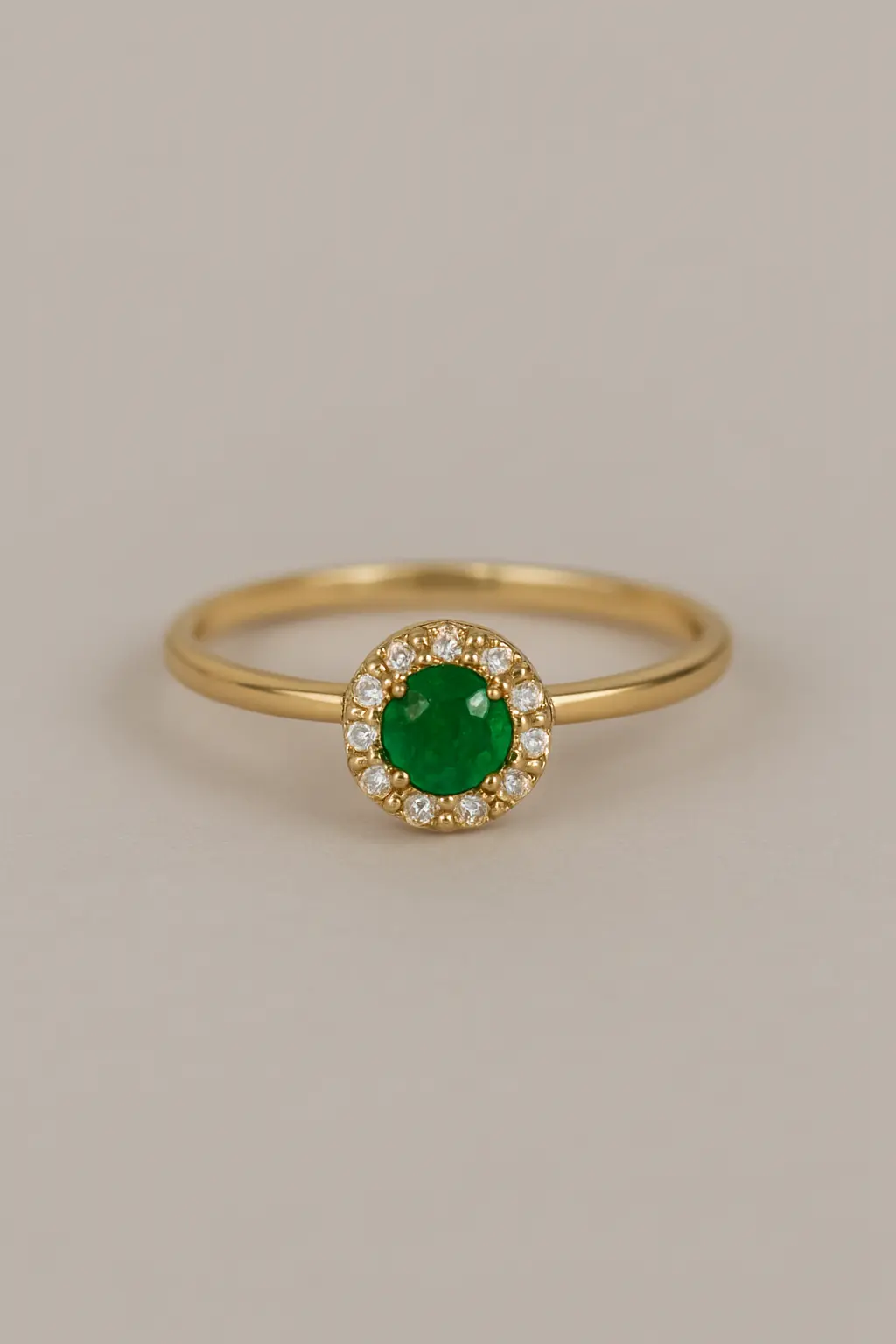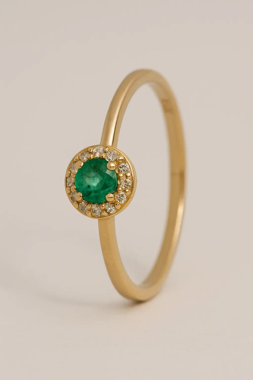 Un tributo a la grandeza del amor eterno. El Anillo Majestad, en oro de 18k, enmarca una delicada esmeralda de 0.11 quilates, realzada por un resplandeciente halo de diamantes de 0.06 quilates. Una creación que trasciende el tiempo, símbolo de promesas inmortales y elegancia suprema.